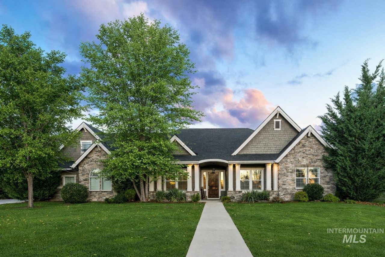 Stunning single-level home on nearly an acre with a private swimming pool in prime Eagle, Idaho! Beautiful private corner lot with no rear neighbors. Recent updates include new AC, furnace, water heater, pool equipment, and refinished hardwood floors. Designed for luxury living and effortless entertaining, the manicured grounds offer a true backyard oasis with a resort-style pool and hot tub, built-in firepit, in-ground trampoline, and sports court or RV pad. Inside, the open-concept great room features a striking stacked-stone fireplace and expansive sliding doors that seamlessly blend indoor and outdoor living. The gourmet kitchen impresses with quartz countertops, ceiling-height custom cabinetry, premium stainless steel appliances, and a spacious walk-in pantry. The private primary suite occupies its own wing with tray ceilings and a spa-inspired ensuite, complete with dual vanities, a freestanding soaking tub, tiled walk-in shower, and an expansive dressing room. A main-level office adds convenience, while an upper bonus room provides flexible space for guests or recreation. Ideally located just minutes from downtown Eagle, premier golf courses, shopping, and dining!